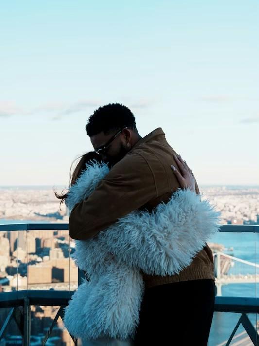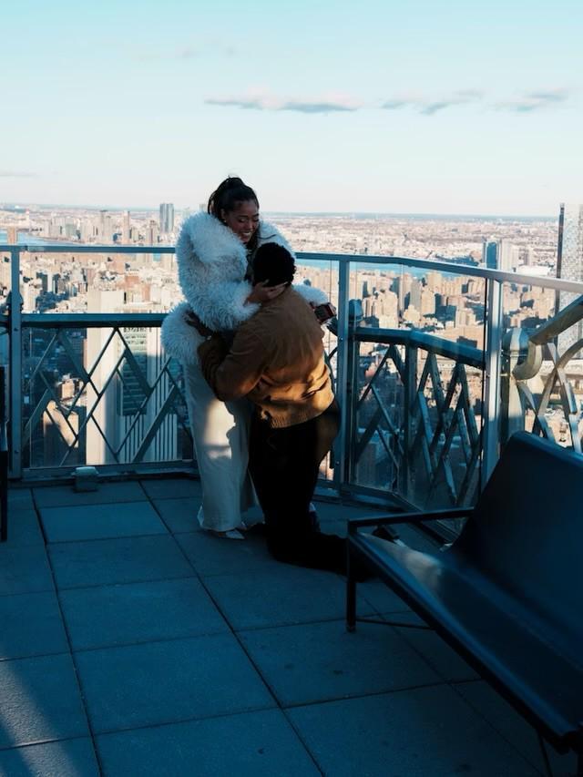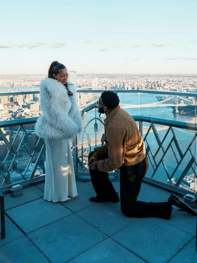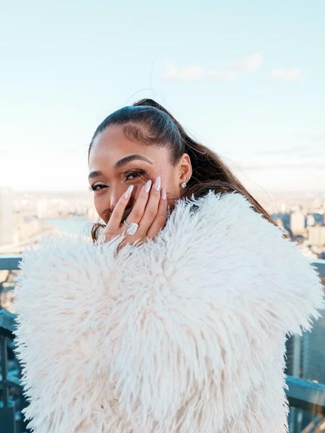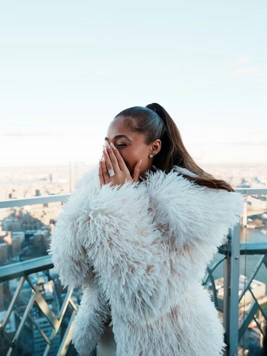 身著一身白衣的喬丹-伍茲和她的未婚夫唐斯站在紐約市“Overstory”雞尾酒吧的絕美風(fēng)景中,看起來(lái)幸福滿滿。