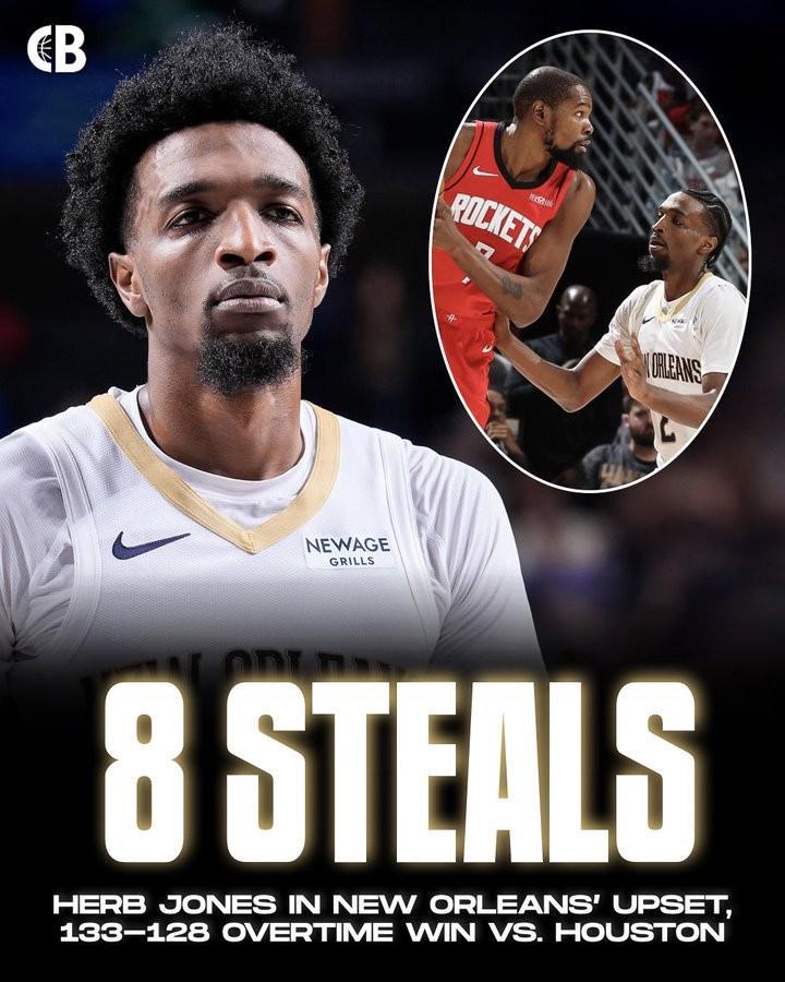 本場比賽,鵜鶘前鋒赫伯特-瓊斯出場38分13秒,14投7中得到了18分3籃板3助攻8搶斷1蓋帽,三分球6中2,罰球2中2,出現(xiàn)了1次失誤和0次犯規(guī),正負(fù)值為+19。