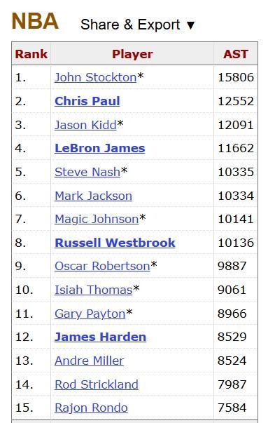 目前詹姆斯以42406分高居總得分榜第一,同時(shí)以11662次助攻排名總助攻榜第四位,排在他身前的是斯托克頓、保羅和基德。
