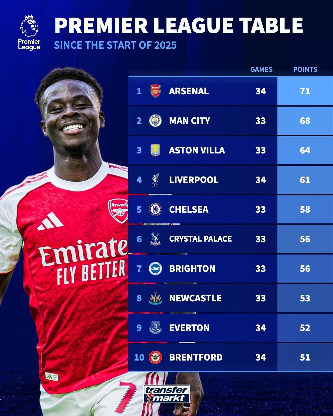 2025年英超積分排行:槍手71分居首,曼城68分第二