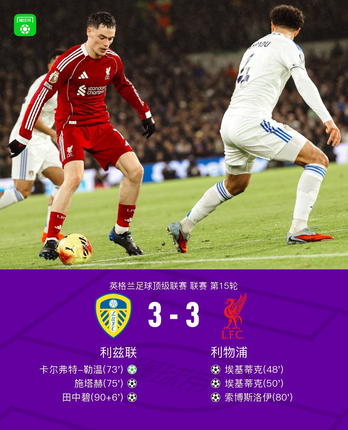 劍南春|利物浦客場(chǎng)3-3利茲聯(lián),田中碧補(bǔ)時(shí)絕平,?;倏穗p響