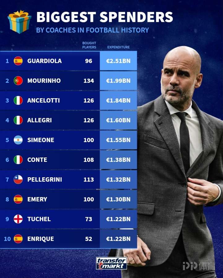1.瓜迪奧拉:25.1億歐,引進(jìn)96人