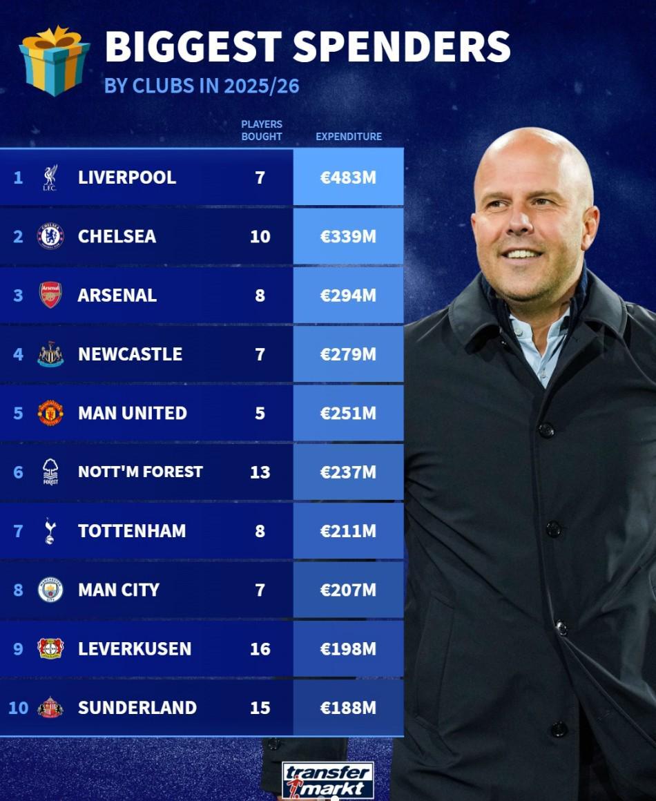 北京時間12月25日,在圣誕節(jié)之際,德轉(zhuǎn)列出了世界足壇本賽季引援支出榜,利物浦以超4.8億歐元高居第一,切爾西約3.4億歐元第二,阿森納約2.9億歐元第三。