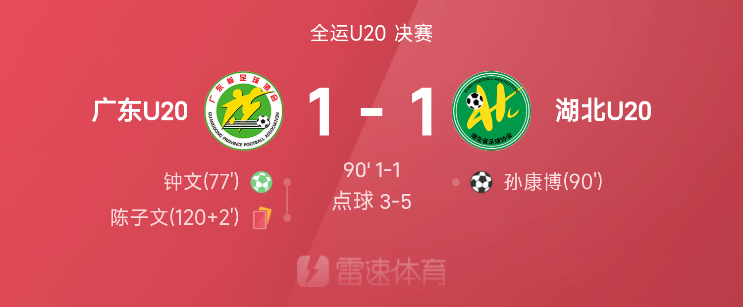 雷速體育11月12日訊 第十五屆全運會U20男足決賽,廣東U20迎戰(zhàn)湖北U20。鐘文造點并親自罰進打破僵局,孫康博世界波絕平比分。雙方加時賽仍然難分勝負,最終進入點球大戰(zhàn)。點球大戰(zhàn)中,王志遠罰丟點球,王智誠罰進制勝一球,湖北U20總比分6-4(點球5-3)戰(zhàn)勝廣東U20,奪得全運會U20金牌。這也是湖北足球首次獲得全運會男足金牌。