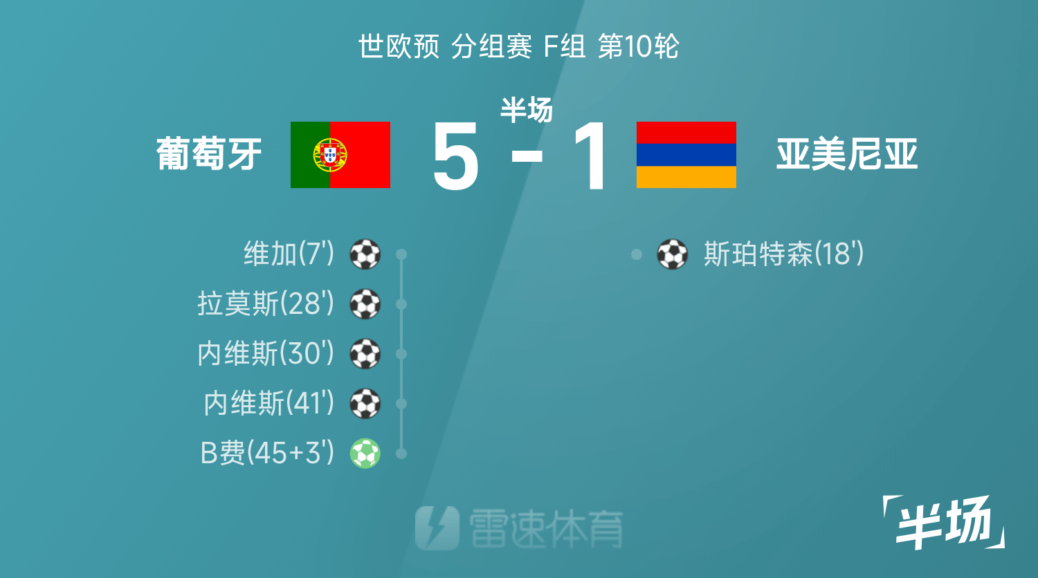 雷速體育11月16日訊 26賽季世歐預(yù)分組賽F組第10輪,葡萄牙迎戰(zhàn)亞美尼亞。半場(chǎng)戰(zhàn)罷,雙方比分暫為葡萄牙5-1亞美尼亞,內(nèi)維斯上演梅開(kāi)二度。