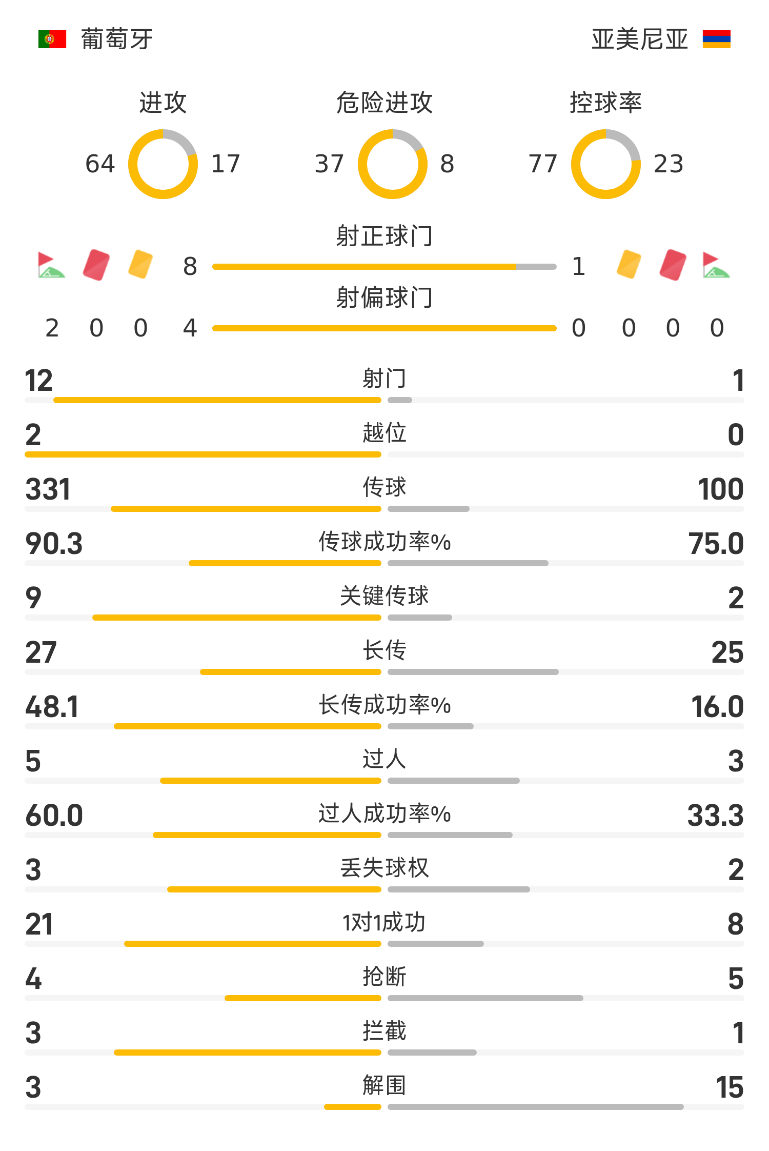 7’維加門(mén)前包抄頭槌破門(mén),葡萄牙閃擊1-0亞美尼亞