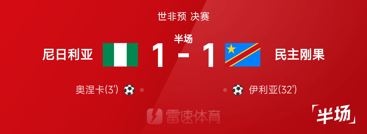 雷速體育11月17日訊 26賽季世非預(yù)決賽,尼日利亞迎戰(zhàn)民主剛果。半場戰(zhàn)罷,雙方比分暫為尼日利亞1-1民主剛果,奧涅卡、伊利亞破門建功。