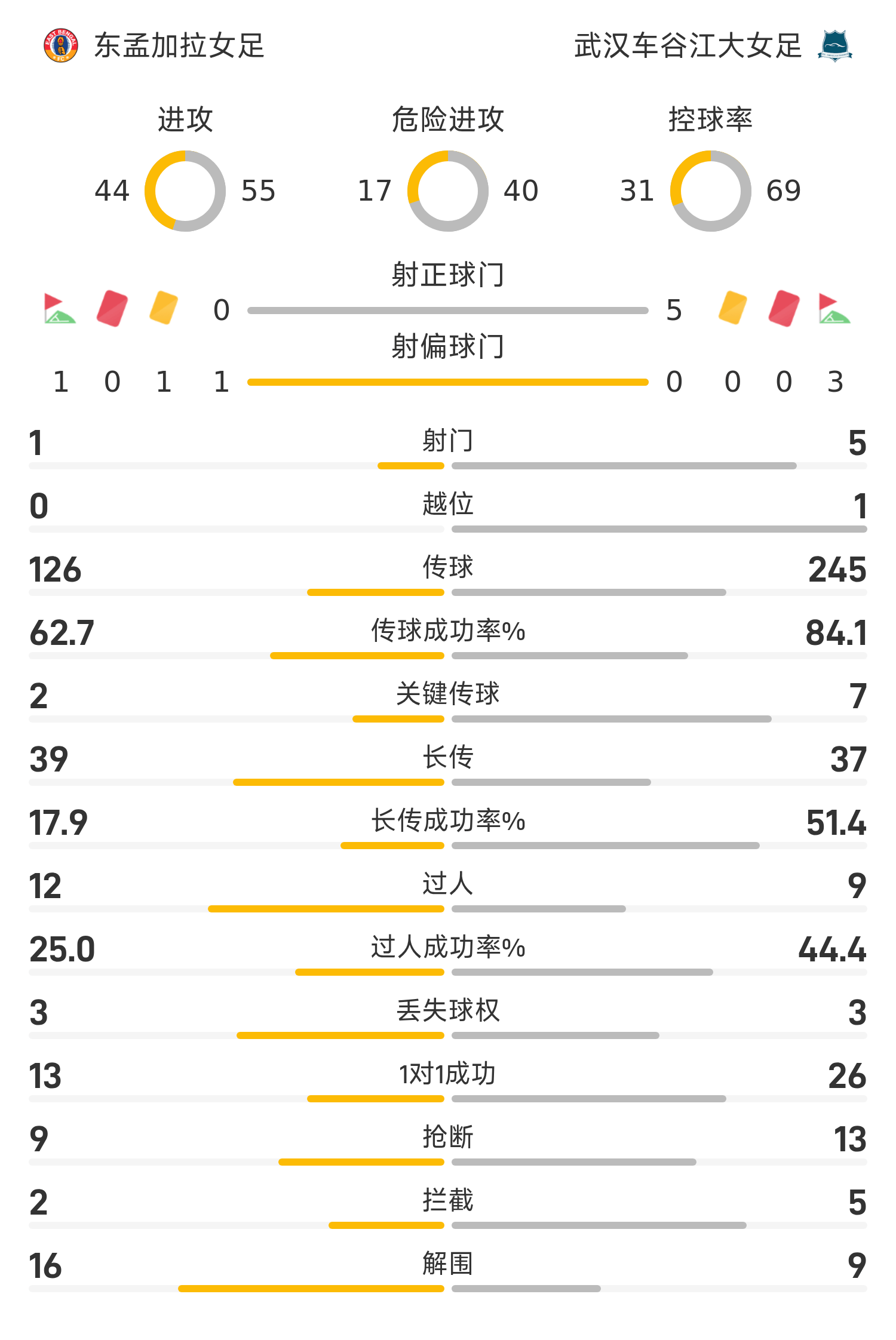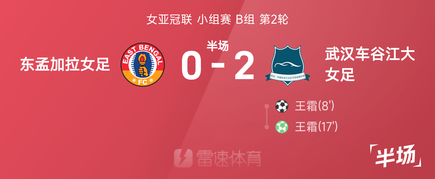 雷速體育11月20日訊 25/26賽季女亞冠聯(lián)小組賽B組第2輪,東孟加拉女足迎戰(zhàn)武漢車谷江大女足。半場(chǎng)戰(zhàn)罷,雙方比分暫為東孟加拉女足0-2武漢車谷江大女足,王霜上演梅開(kāi)二度。
