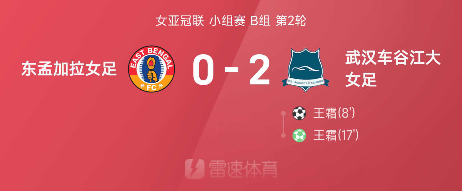 雷速體育11月20日訊 25/26賽季女亞冠聯(lián)小組賽B組第2輪,武漢車谷江大女足2-0戰(zhàn)勝東孟加拉女足,獲新賽季亞冠首勝,小組賽前2輪1勝1平。全場(chǎng)比賽,王霜上演梅開二度。