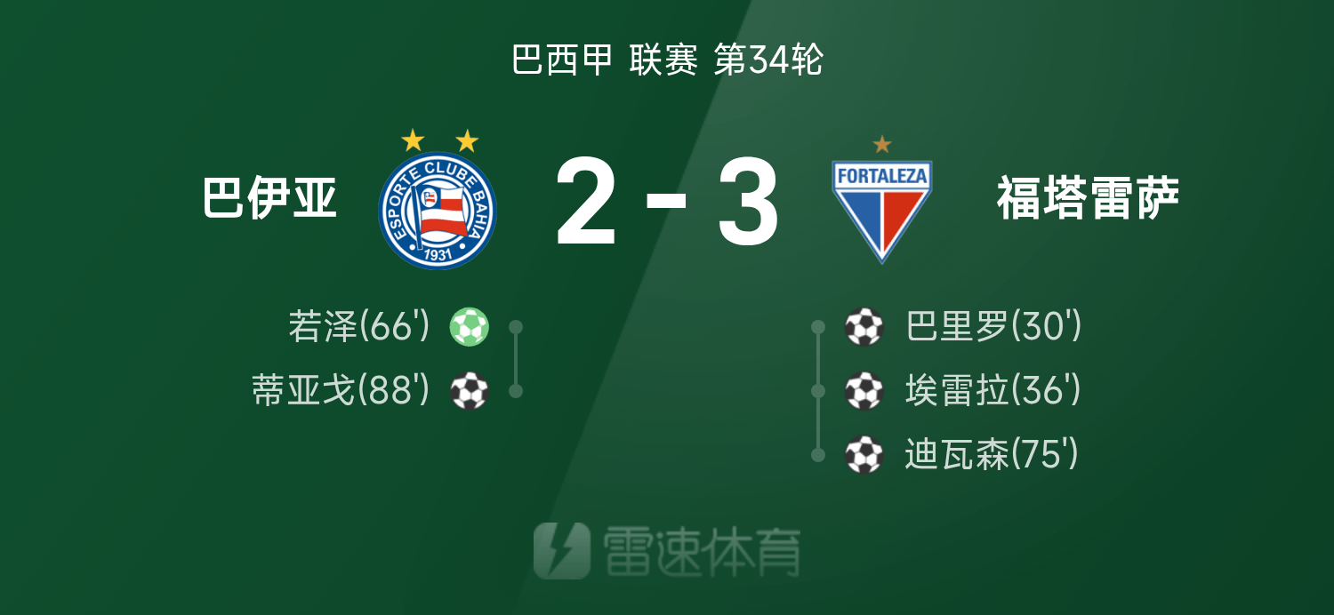 雷速體育11月21日訊 25賽季巴西甲聯(lián)賽第34輪,福塔雷薩3-2戰(zhàn)勝巴伊亞。全場比賽,埃雷拉發(fā)揮出色貢獻1射1傳,巴里羅、迪瓦森破門建功,若澤、蒂亞戈破門難救主。