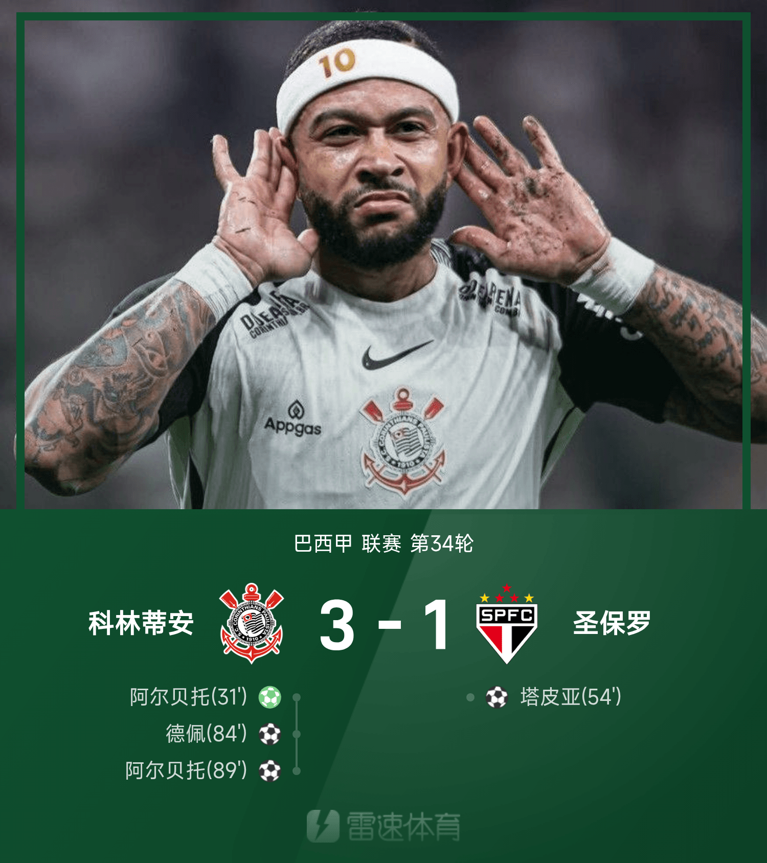 雷速體育11月21日訊 25賽季巴西甲聯(lián)賽第34輪,科林蒂安3-1戰(zhàn)勝圣保羅。全場比賽,阿爾貝托上演梅開二度,德佩破門建功,塔皮亞破門難救主。