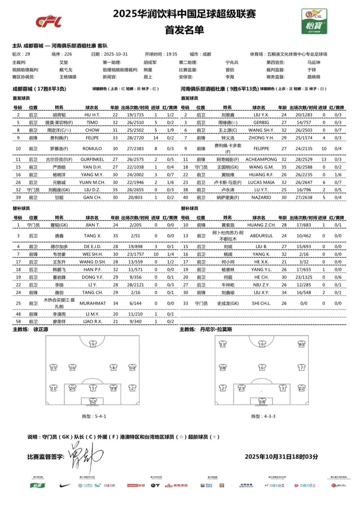 北京時(shí)間10月31日19:35,中超第29輪成都蓉城將坐鎮(zhèn)主場迎戰(zhàn)河南建業(yè),艾堃出任本場主裁判。雙方賽前公布首發(fā)名單。