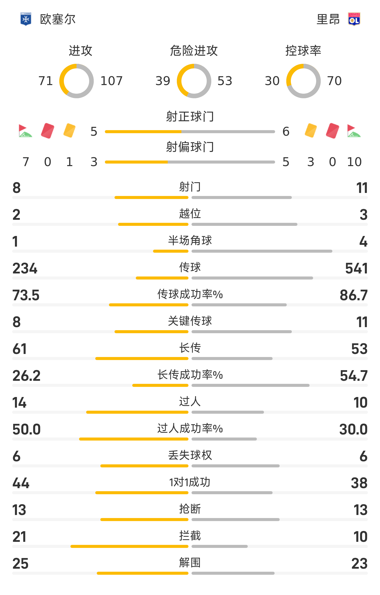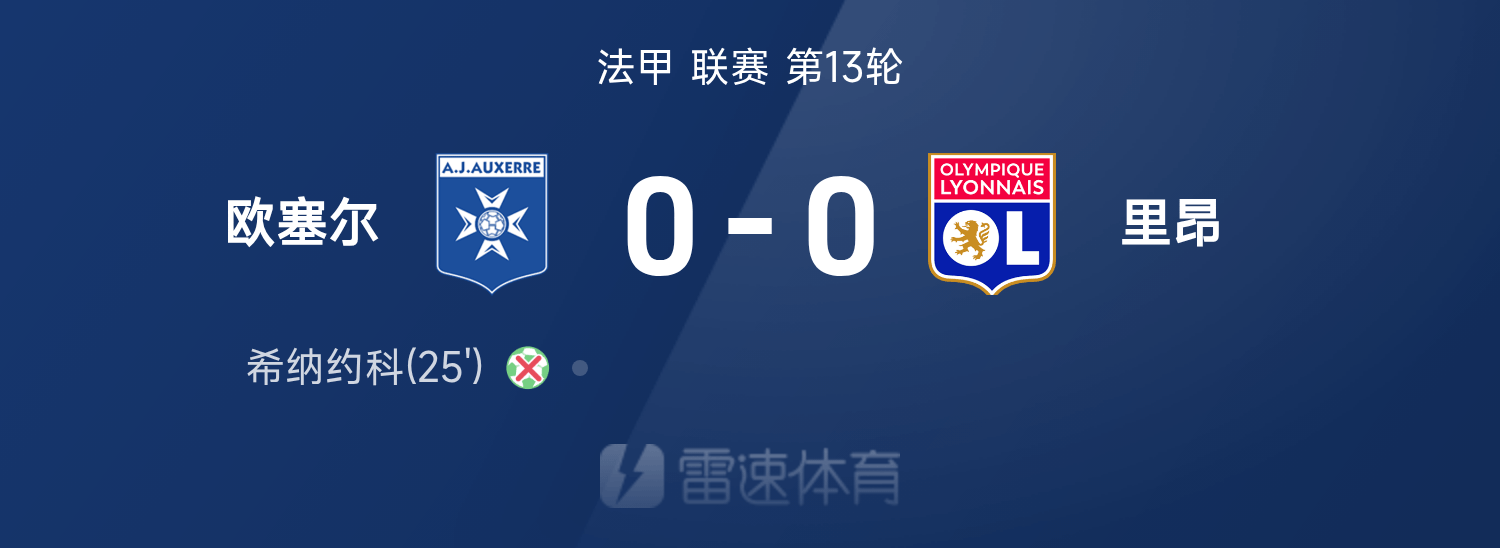 雷速體育11月23日訊 25/26賽季法甲聯(lián)賽第13輪,歐塞爾0-0互交白卷悶平里昂。全場比賽,希納約科失點(diǎn)。