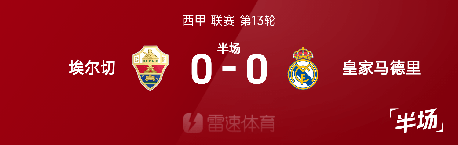 雷速體育11月24日訊 25/26賽季西甲聯(lián)賽第13輪,埃爾切迎戰(zhàn)皇家馬德里。半場戰(zhàn)罷,雙方比分暫為埃爾切0-0皇家馬德里。