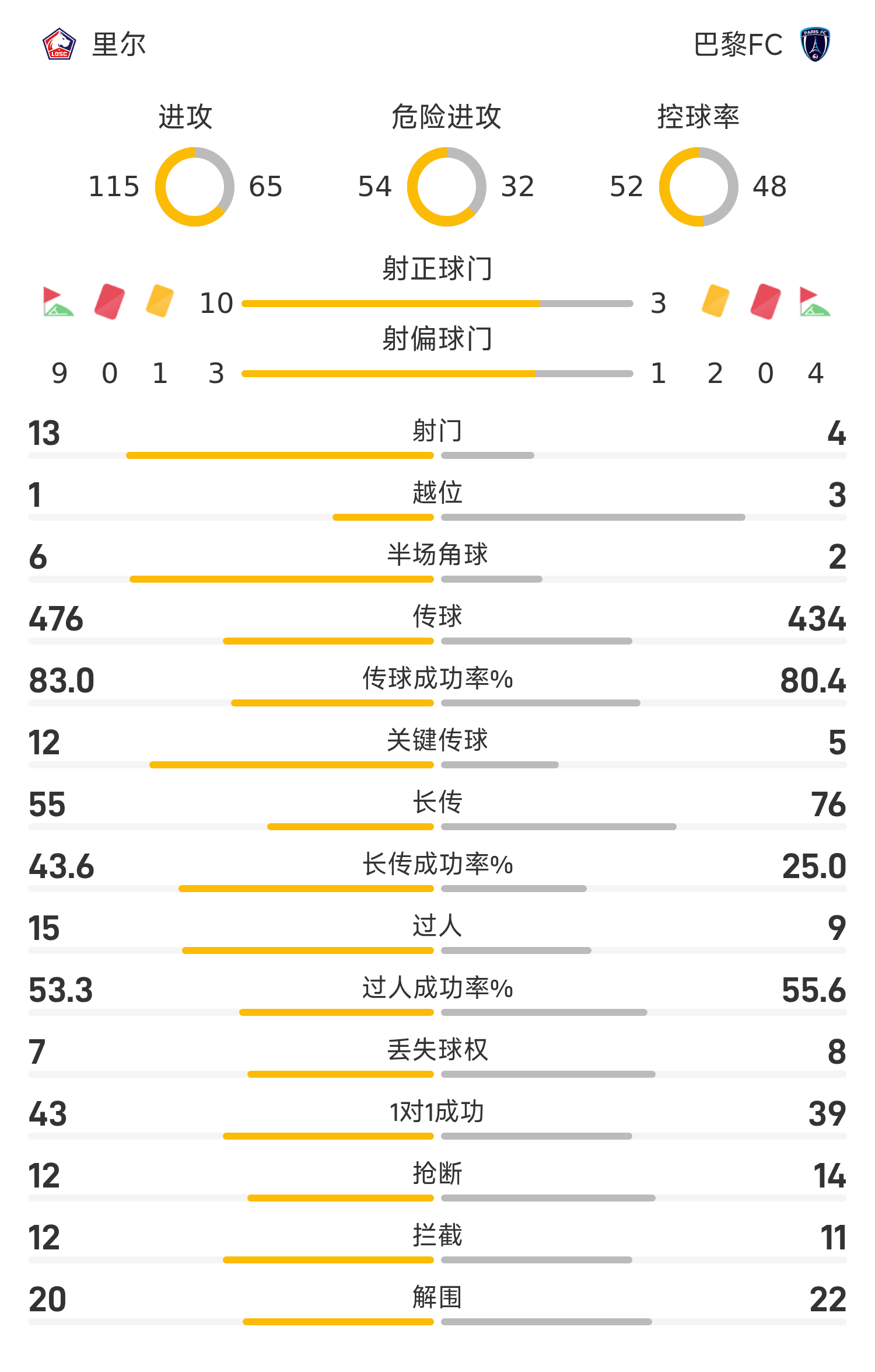 里爾首發(fā)陣容:1-奧茲爾、23-曼迪(86’3-恩戈伊)、12-穆尼耶、18-姆本巴、15-佩勞德、6-本塔萊布(73’17-穆考)、27-科雷亞、11-奧薩姆(73’14-布羅霍爾姆)、32-布阿迪、9-吉魯(86’8-E.姆巴佩)、29-伊格曼(61’10-哈拉茲森)