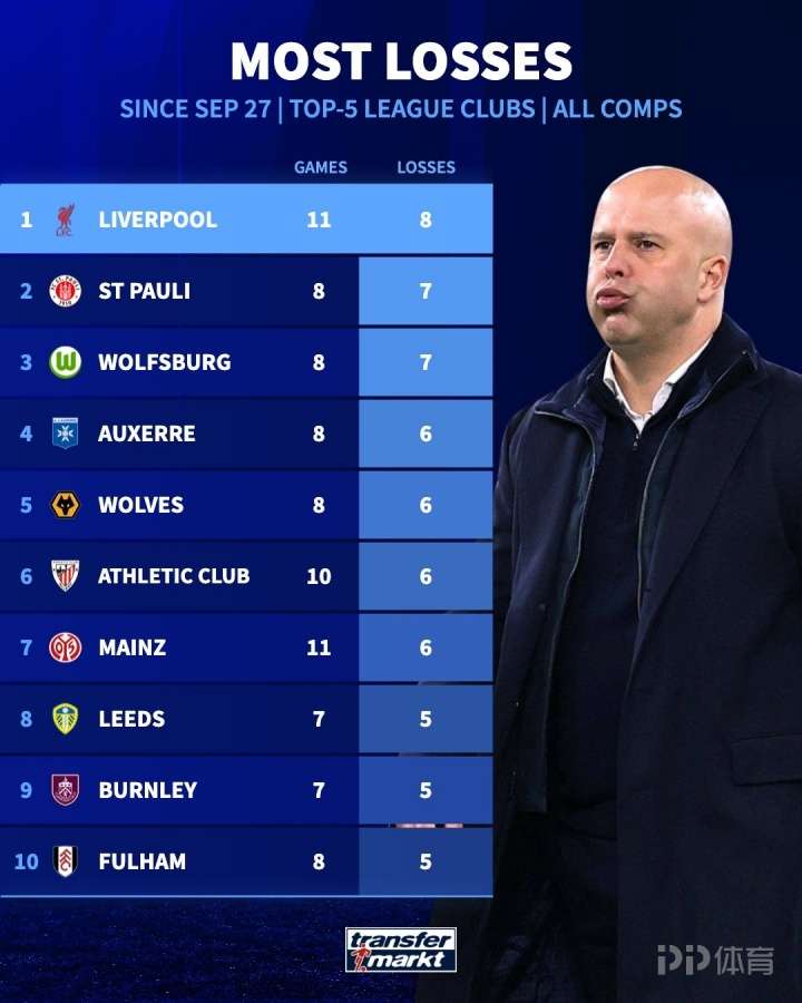 德轉(zhuǎn)統(tǒng)計(jì)了自9月27日以來(lái)五大聯(lián)賽球隊(duì)的輸球榜,利物浦以8場(chǎng)比賽高居榜單第一位。