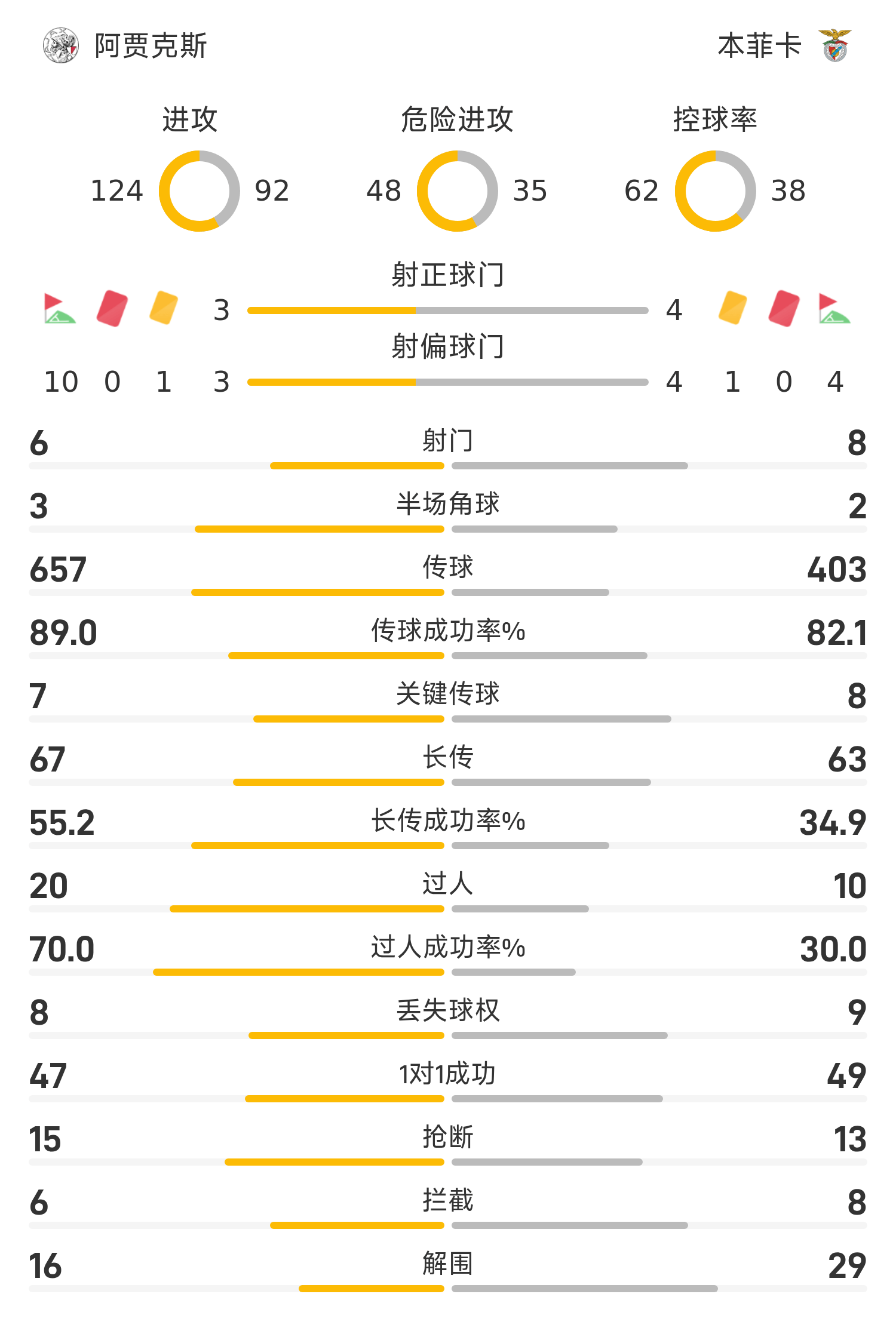 雷速體育11月26日訊 25/26賽季歐冠聯(lián)賽第5輪,本菲卡2-0戰(zhàn)勝阿賈克斯。開場僅6分鐘,達爾禁區(qū)內(nèi)抽射破門,幫助本菲卡取得領先。領先后的本菲卡選擇退縮防守,盡管阿賈克斯創(chuàng)造出了不少機會,但由于門前把握機會能力欠佳,始終未能扳平比分。比賽最后時刻,巴雷羅反擊破門,將比分改寫為2-0,幫助本菲卡鎖定勝局。