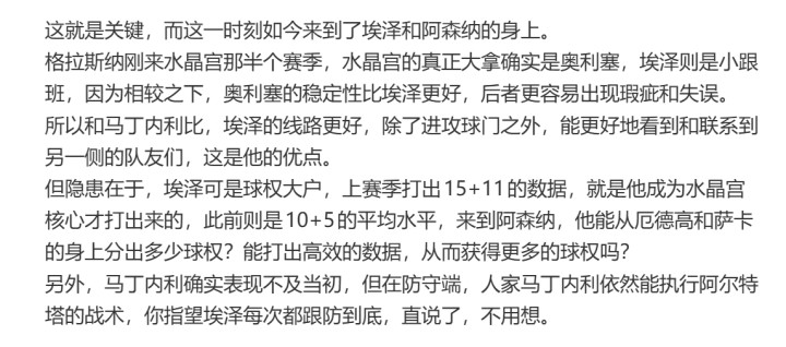 所以從這個(gè)角度來說,阿森納當(dāng)然可以覺得自己很倒霉,這一點(diǎn)也的確是事實(shí),包括埃澤的防區(qū)丟球,也是新援加盟,來到新位置需要交的學(xué)費(fèi),但在這些事情之外,阿森納也需要觀察一下自己的戰(zhàn)術(shù)流暢度。