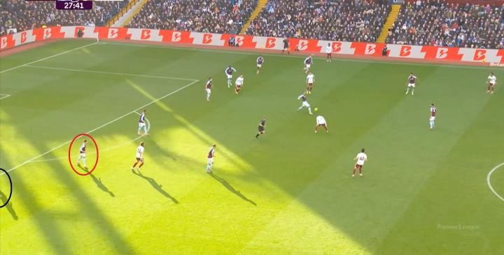 所以在第28分鐘,阿斯頓維拉完成搶斷之后,發(fā)動(dòng)了左路的進(jìn)攻,一腳傳中打到禁區(qū)內(nèi),便來到了后點(diǎn)的卡什腳下: