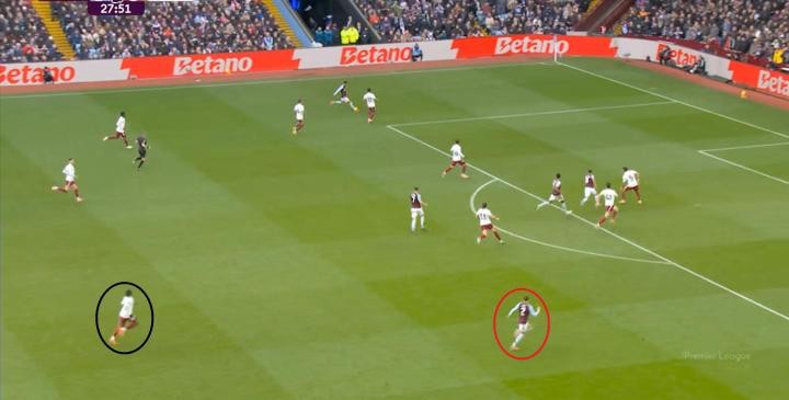 另外,阿斯頓維拉通過長傳球,也能繞過逼搶和中場,直接從前場打出攻勢(shì):