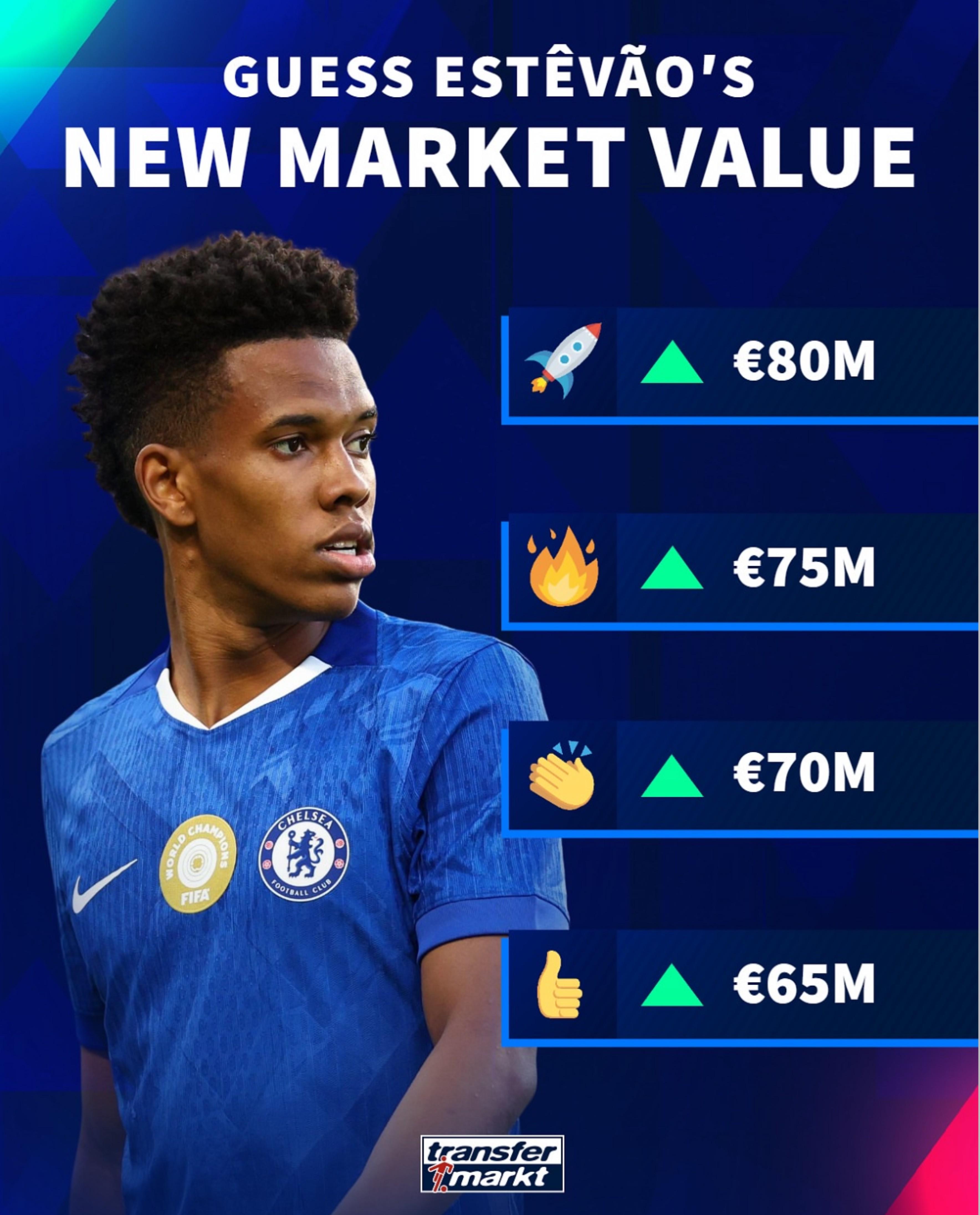 德轉給出了4個可能的結果,上漲至6500萬歐、上漲至7000萬歐、上漲至7500萬歐、上漲至8000萬歐。目前球員的身價為6000萬歐。