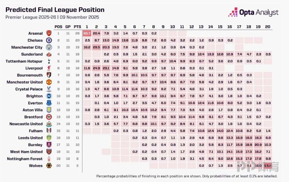OPTA報(bào)道:盡管昨天在桑德蘭戰(zhàn)平,阿森納在OPTA超級(jí)計(jì)算機(jī)當(dāng)前模擬中仍以65.7%的概率贏得2025-26賽季英超冠軍。