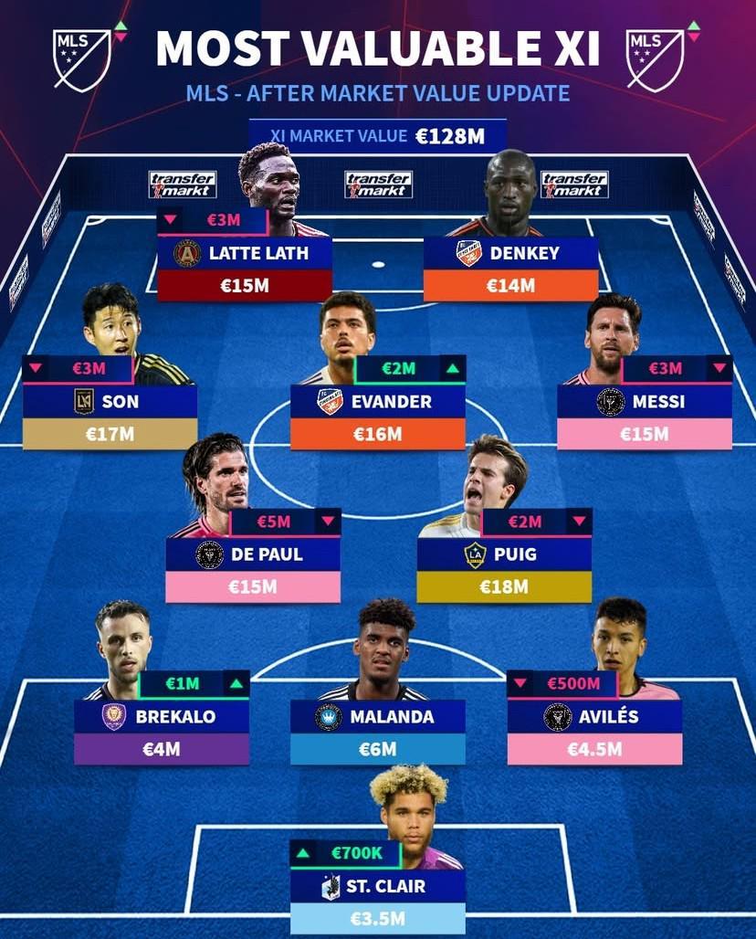 普伊奇(洛杉磯銀河)1800萬歐元(-200萬歐元)、德保羅(邁阿密國際)1500萬歐元(-500萬歐元)、梅西(邁阿密國際)1500萬歐元(-300萬歐元)、伊萬德(辛辛那提)1600萬歐元(+200萬歐元)、孫興慜(洛杉磯)1700萬歐元(-300萬歐元)