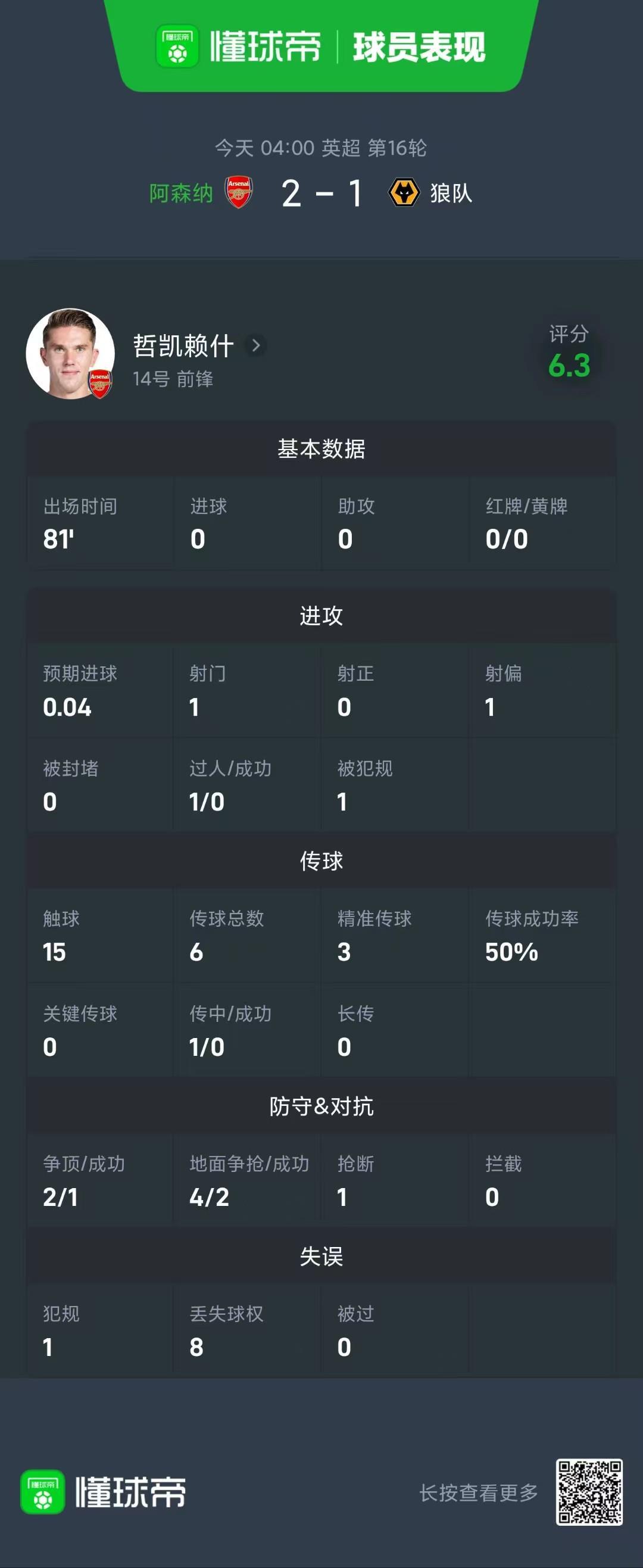 本場(chǎng)比賽,槍手前鋒哲凱賴什首發(fā)出戰(zhàn)81分鐘,1次射門0次射正,在場(chǎng)上僅觸球15次。其他數(shù)據(jù)方面,哲凱賴什0次成功過人,6次傳球3次成功,8次丟失球權(quán)。