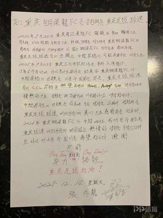 在張外龍告別重慶銅梁龍后,《足球報》曬出了他親手寫的告別信。