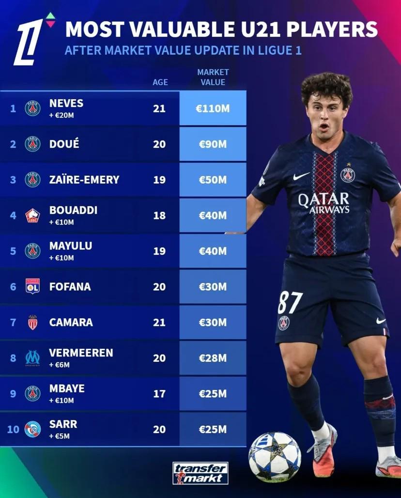 北京時(shí)間12月15日,在更新了法甲球員的身價(jià)之后,德轉(zhuǎn)列出了法甲U21球員身價(jià)榜,此次更新后身價(jià)暴漲2000萬歐元并升至1.1億歐元的若昂-內(nèi)維斯排名第一,杜埃9000萬歐元第二,扎伊爾-埃梅里5000萬歐元第三。