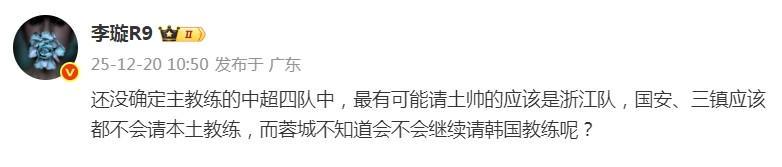 媒體人李璇寫道:“還沒確定主教練的中超四隊(duì)中,最有可能請土帥的應(yīng)該是浙江隊(duì),北京國安、武漢三鎮(zhèn)應(yīng)該都不會請本土教練,而成都蓉城不知道會不會繼續(xù)請韓國教練呢????”