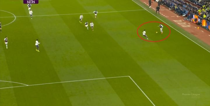 比賽第33分鐘,維拉在后場(chǎng)輕松起腳,沃特金斯和隊(duì)友在海文和烏加特的身上打出并保住優(yōu)勢(shì),從而將球權(quán)轉(zhuǎn)給了邊路的羅杰斯,讓他有了和約羅一對(duì)一的機(jī)會(huì):