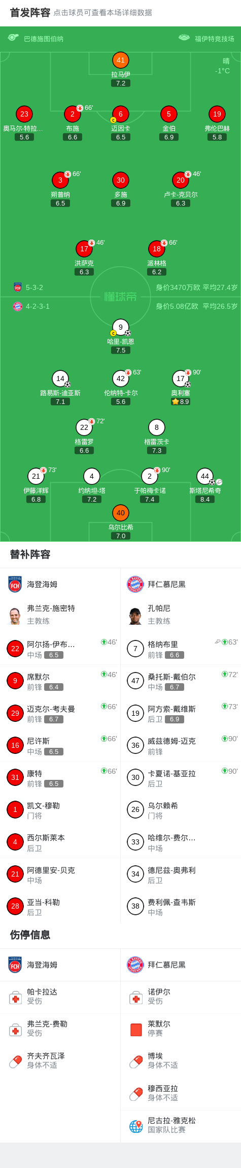 北京時(shí)間12月22日德國(guó)足球頂級(jí)聯(lián)賽 聯(lián)賽 第15輪,海登海姆主場(chǎng)對(duì)陣拜仁慕尼黑。上半場(chǎng)拜仁角球,斯塔尼希奇頭球破門(mén),之后拉馬伊被隊(duì)友撞倒,伊藤洋輝傳球變線,奧利塞破門(mén)。下半場(chǎng)尾聲斯塔尼希奇?zhèn)髦?,迪亞斯俯身頭球破門(mén),補(bǔ)時(shí)階段格納布里傳球,凱恩禁區(qū)內(nèi)晃動(dòng)后低射破門(mén)。最終拜仁4-0戰(zhàn)勝海登海姆。