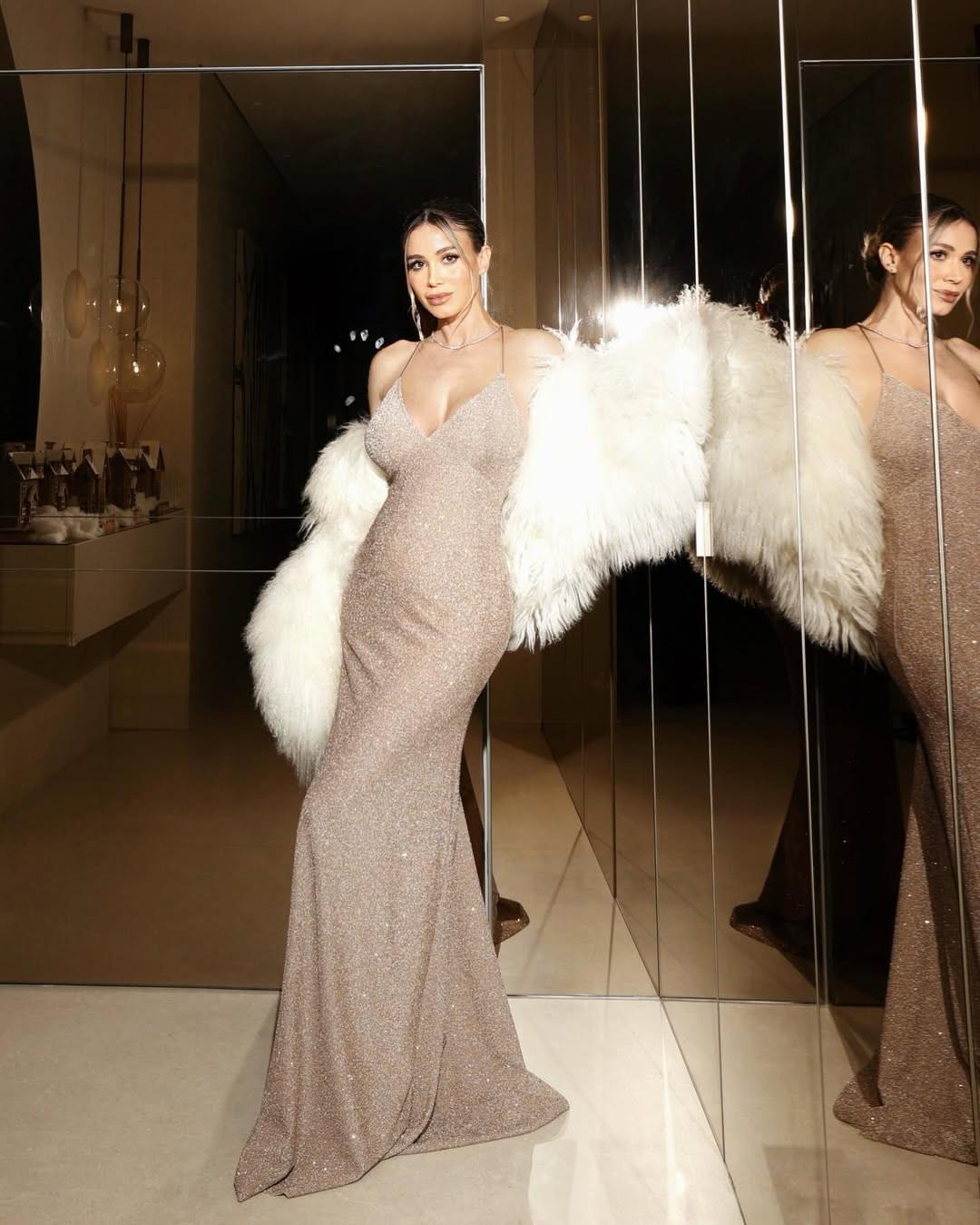 在最新曝光的寫真中,32歲的萊奧塔為意大利品牌Atelier Eme拍攝宣傳照。她站在圣誕樹旁擺拍,金色禮服剪裁貼身,低胸設計突出造型細節(jié)。她將金色長發(fā)向后梳成低發(fā)髻,并搭配一條簡約項鏈。