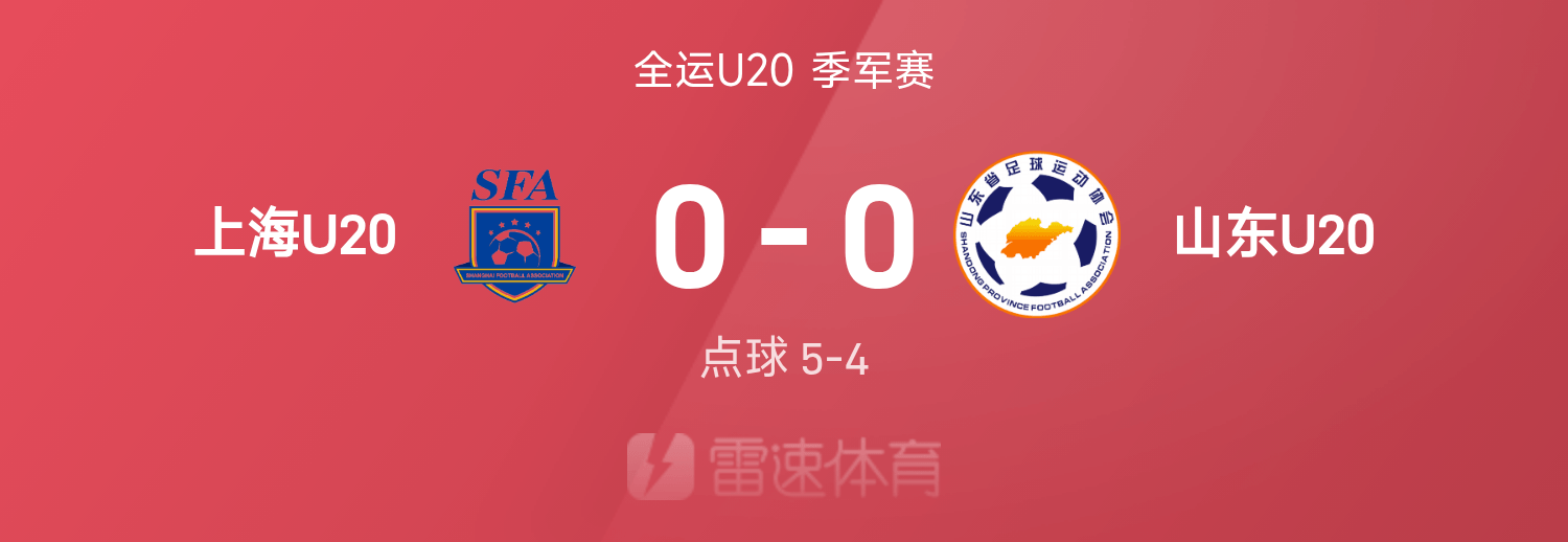 雷速體育11月12日訊 第十五屆全運會U20男足季軍賽,上海U20對戰(zhàn)山東U20。上半場,杜月徵造險,上海隊門將劉浩然屢次做出撲救。下半場,雙方互有攻守,但均未能取得進球。90分鐘戰(zhàn)罷,雙方互交白卷,比賽進入點球大戰(zhàn)。點球大戰(zhàn),上海U20隊全部罰中,山東U20隊宮睿聰罰丟一球,上海U20隊(0-0)(點球5-4)戰(zhàn)勝山東U20隊奪得銅牌。